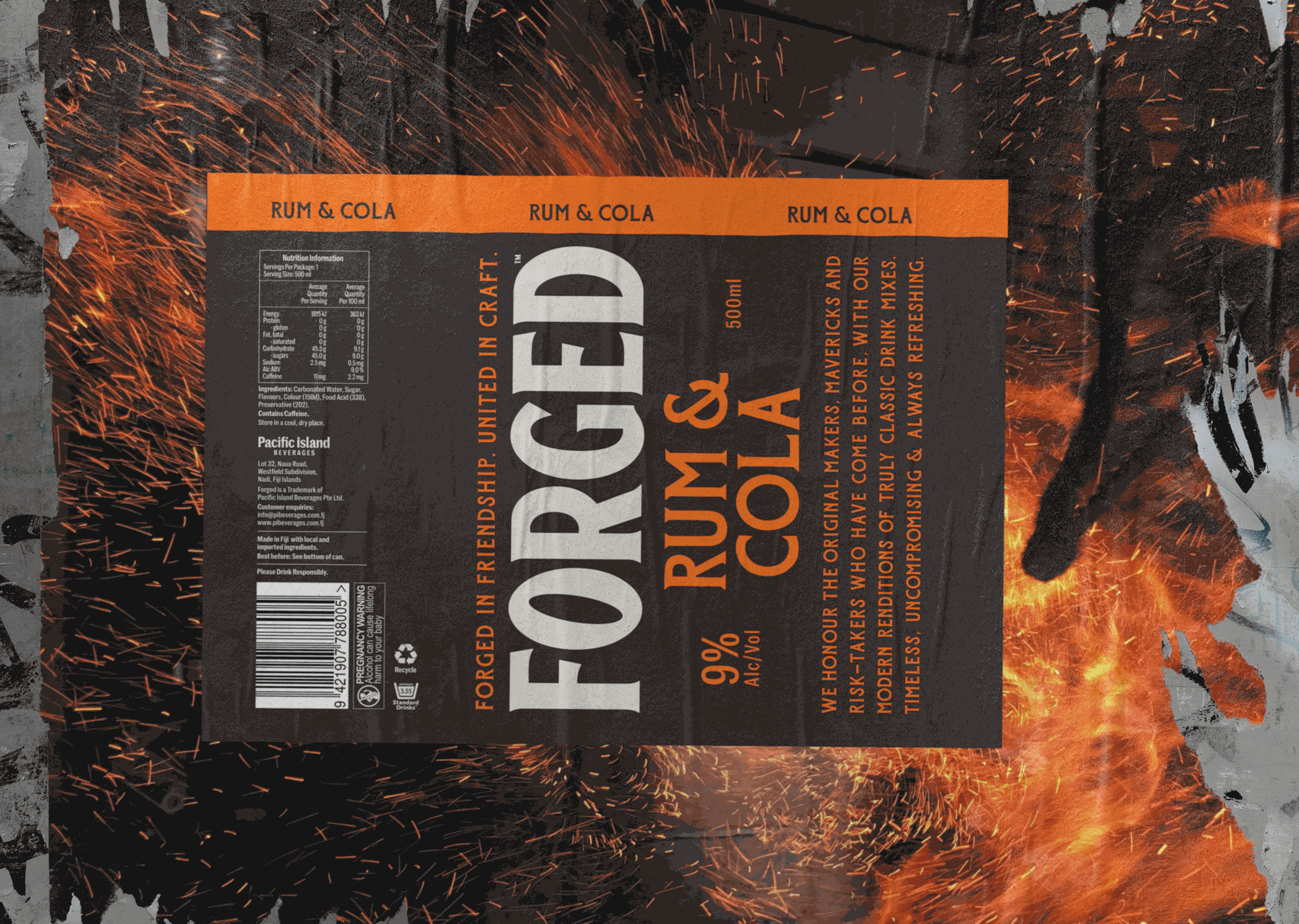 Fiji's alcohol market, driven by tourism, favors expensive international brands, with cheaper local options filling gaps. Pacific Island Beverages, a local Suva startup, launched Forged—a range of dark and light RTD cocktails blending familiar mixes with Fijian flair. Named for friendship and Fijian kinship, Forged symbolizes strength and loyalty. The brand features dark palettes and heritage cues with a modern, minimal design: bold, proud wordmark with soft serifs, a quirky historical secondary font, and minimal color palettes to distinguish mixes. Retail packaging uses typography and color contrast for impact, while off-pack patterns add visual interest.